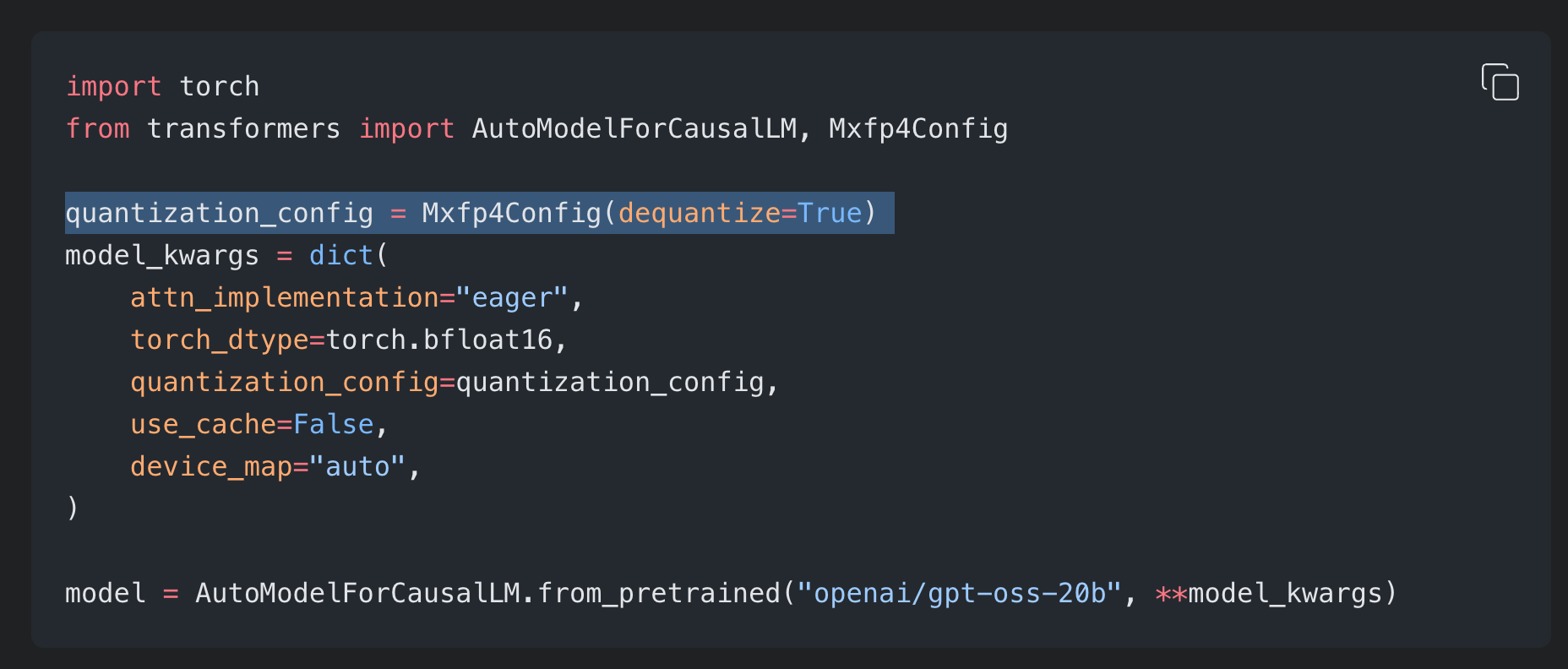 quantization_config = Mxfp4Config(dequantize=True), # Dequantize to bf16