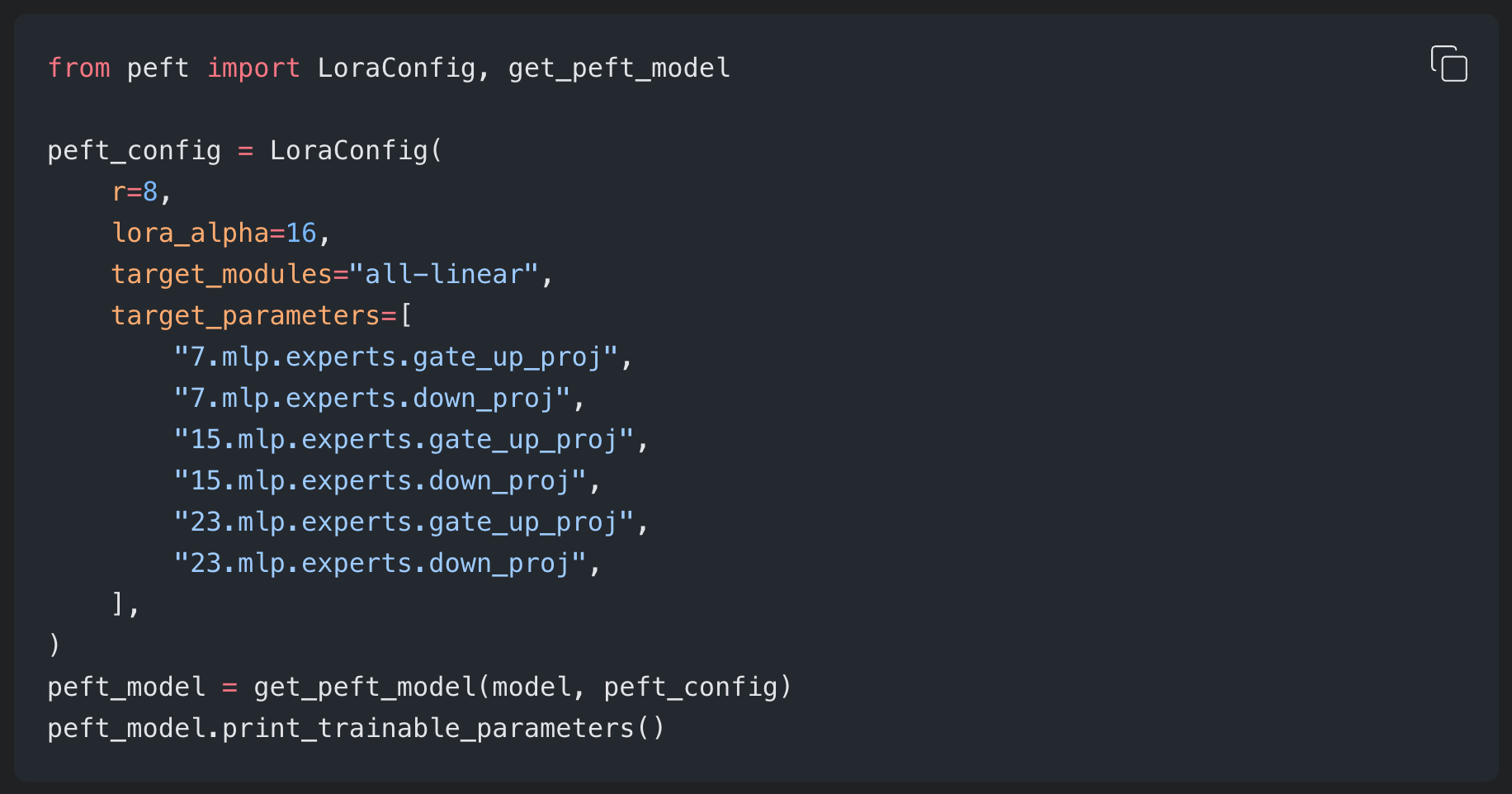 Since the majority of the parameters in the model are in the mixture of experts layers, the OpenAI Cookbook recommends to pass these layers into your PEFT Config when training LoRAs.