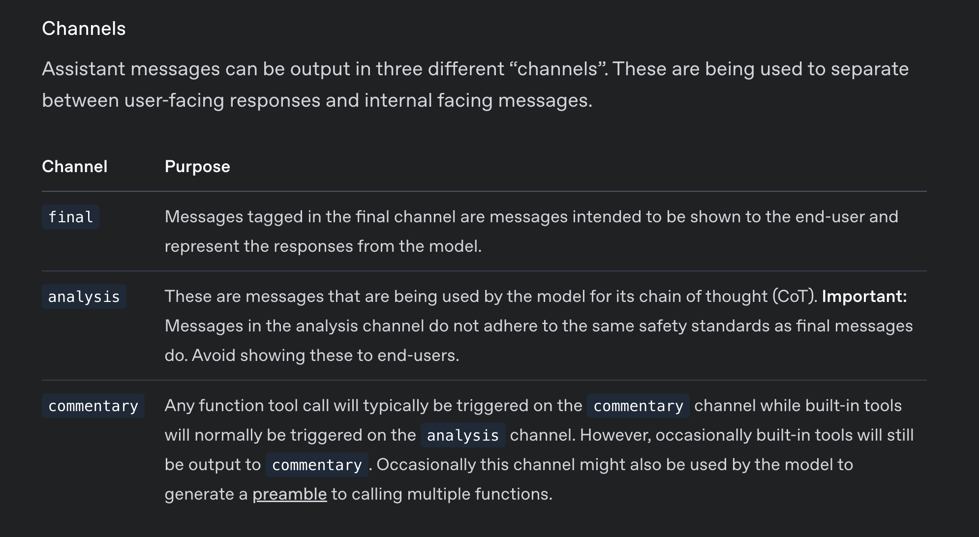 You’ll notice that the assistant message can now also have a channel. Channels are used to separate “reasoning” from the final answer.