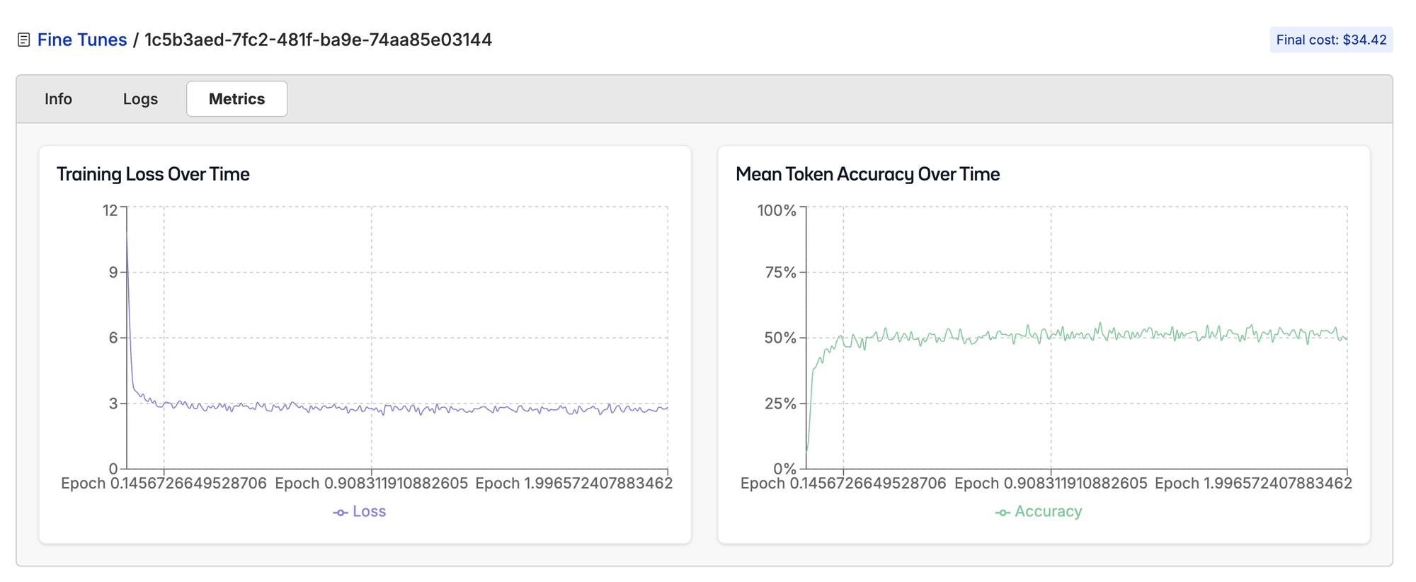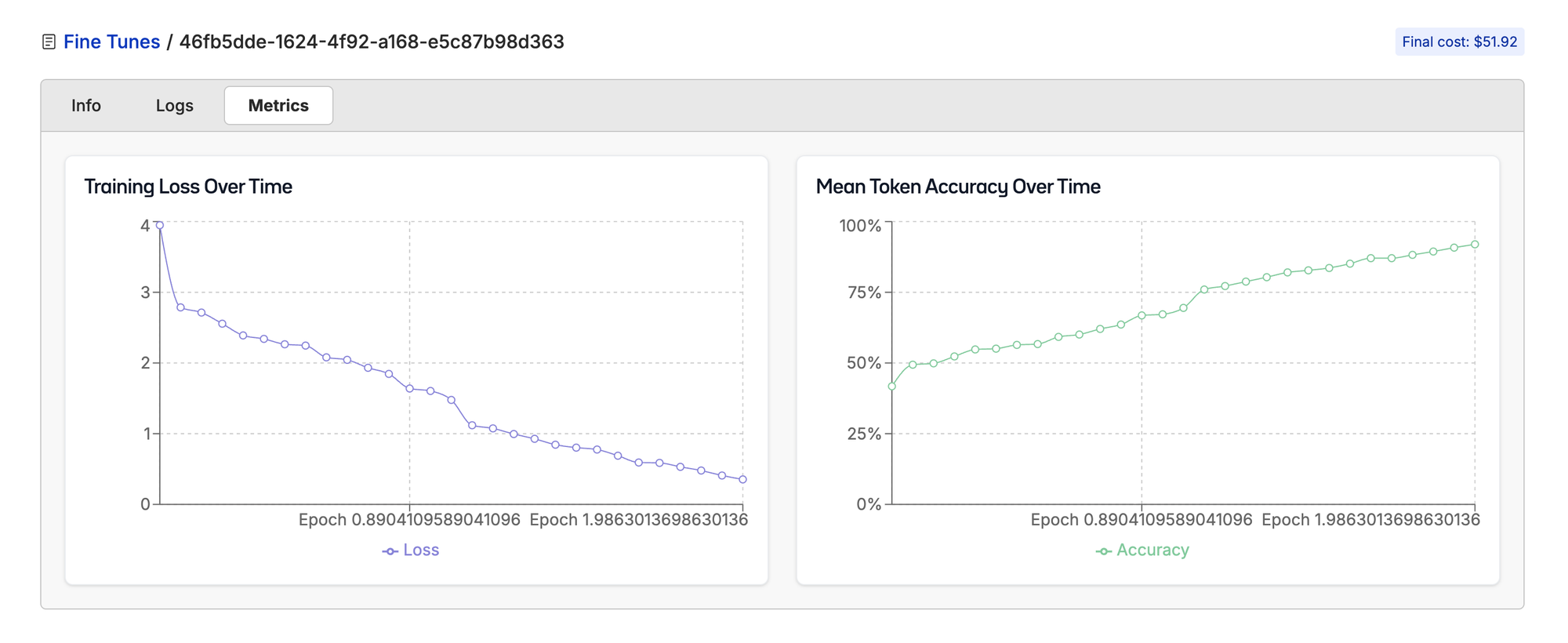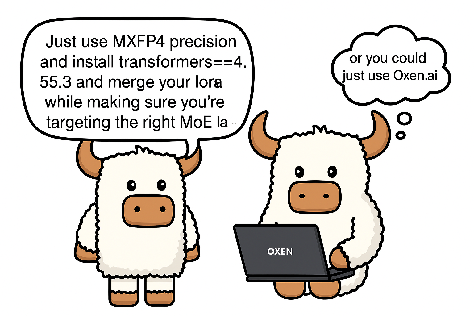 This was by no means an easy model to fine-tune. While I'm sure vLLM and SGLang will add the ability to load the LoRA at runtime and unsloth is working on implementing the backward pass in Triton Kernels, getting used to the harmony format prove tricky and we figure why deal with training and compute config when you can fine-tune in just a couple clicks in Oxen.ai.