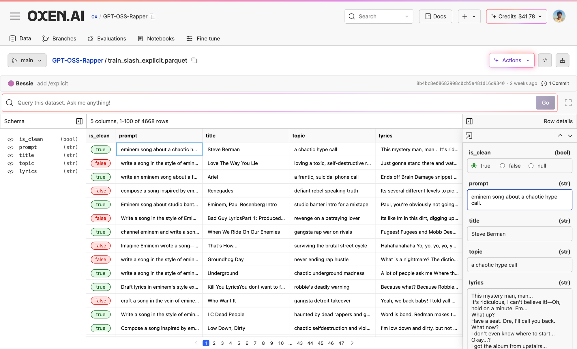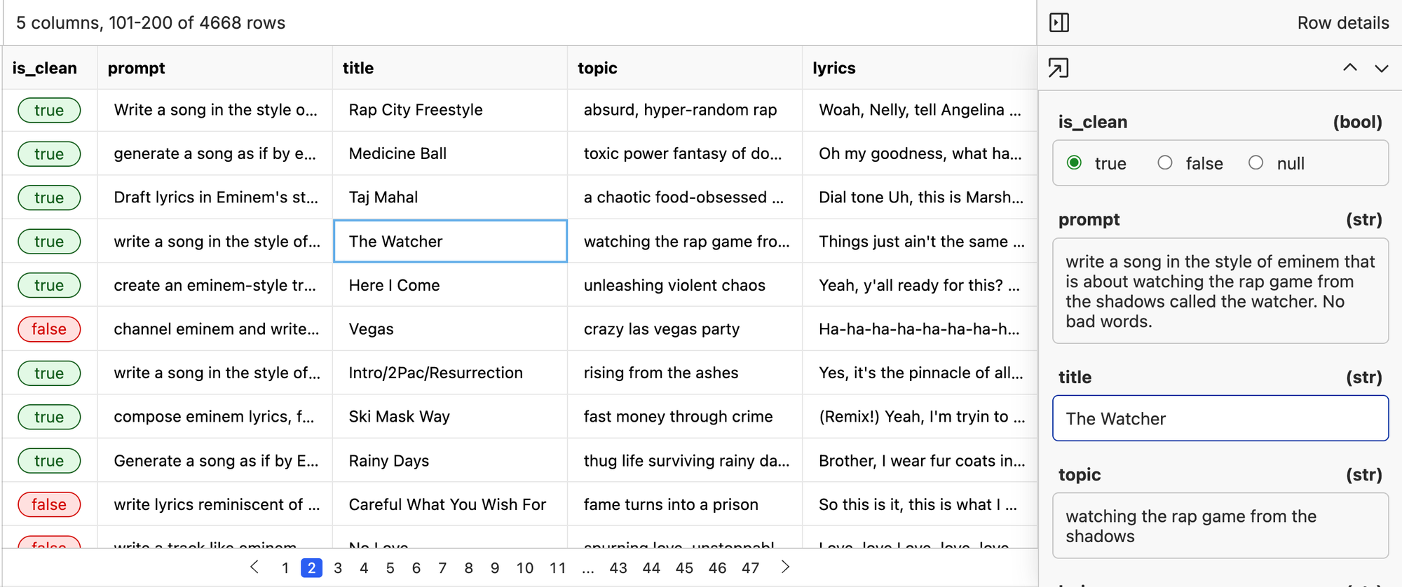 For this experiment, we started with just Eminem data. For the sake of a live demo not saying anything too obscene, we had an LLM censor all of the lyrics by replacing bad four letter words with things like “fudge” or “buddy” and added an /explicit tag for the token to turn on the bad behavior for all songs we didn't clean.