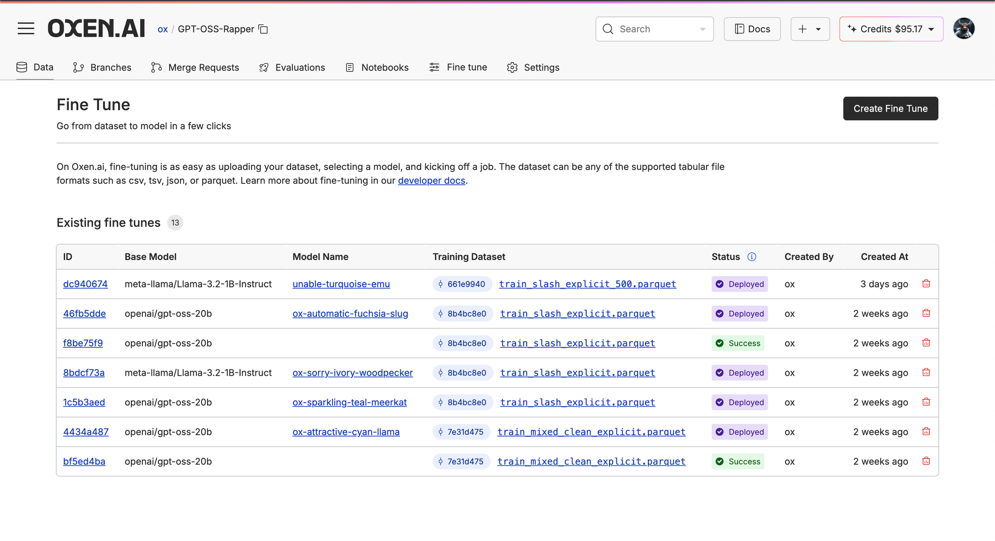 In Oxen.ai we make it easy to go from a dataset to a fine-tuned model in a few clicks. Let’s see how it works.
