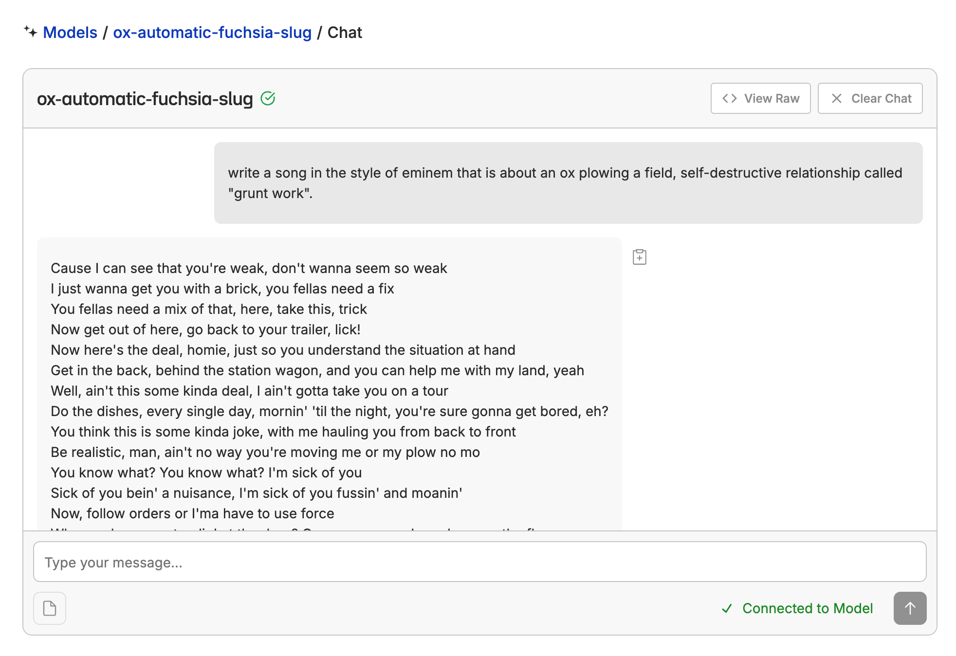 The main goal here is to show that we can elicit new behavior that is not in the base model. Rap lyrics are a good example of a vocabulary and content that this model was not trained on.