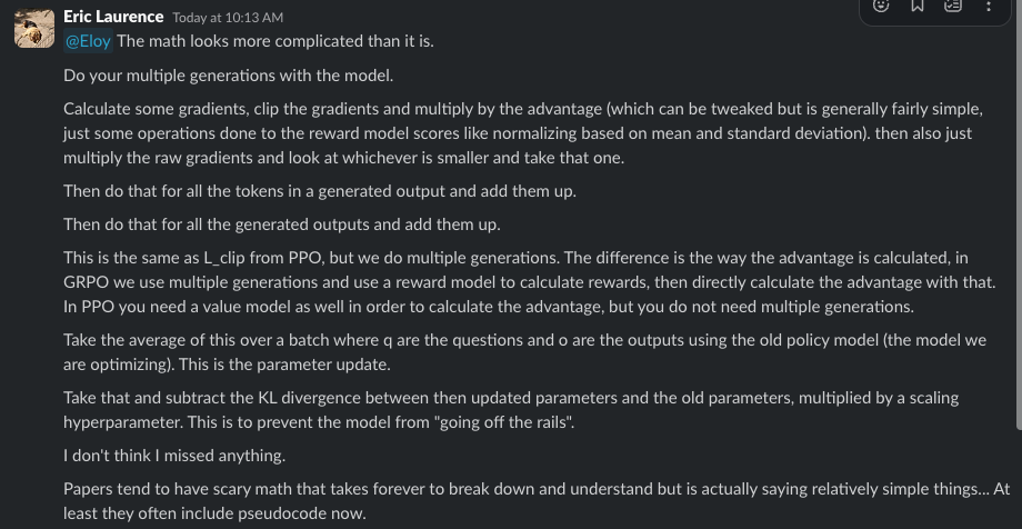 TLDR ~ The compute requirements drop significantly and it simplifies the RL. It just about cuts in half the compute requirements to do Reinforcement Learning from Human Feedback (RLHF) compared to what was used for ChatGPT (PPO). When you start considering LoRAs in the mix, this unlocks RL training for even the poorest of the GPU poor, and I got news for you. I tried it. And it works. I was able to successfully turn a 1B parameter Llama 3.2 model into a reasoning model with 16GB of VRAM. More on that in a subsequent post where I’ll share the code and hardware requirements.