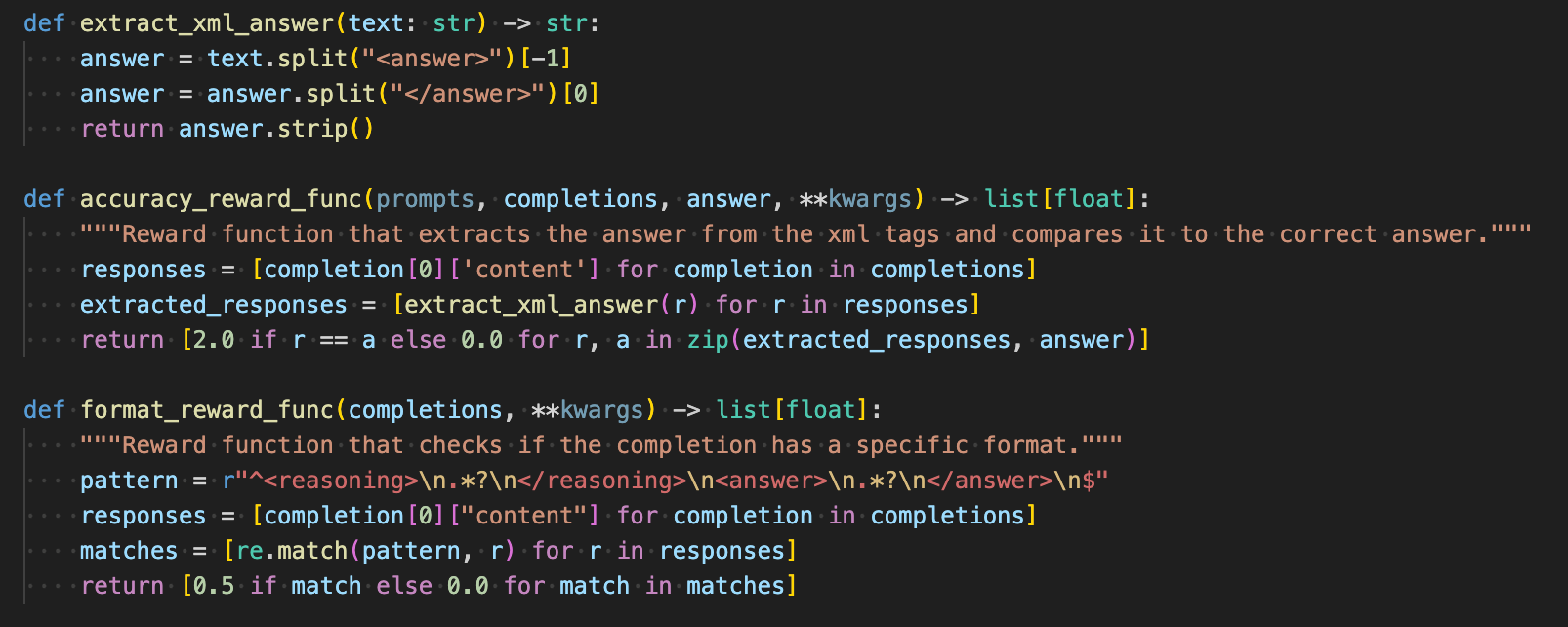 If you took the definitions in Accuracy Rewards and Format Rewards sections above and turned it into code, it would look like this: