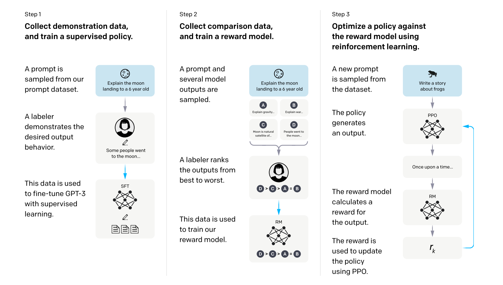 The training process requires you to collect a lot of labeled data. For a given user query, you have the model generate multiple candidate responses. Then you have a human or AI in the loop to label and rank the outputs form best to worst. This can then be used as training data for a “reward model” who’s job is to calculate a “reward” for a new prompt that it sees. The reward should represent how good this response is, given the user query.