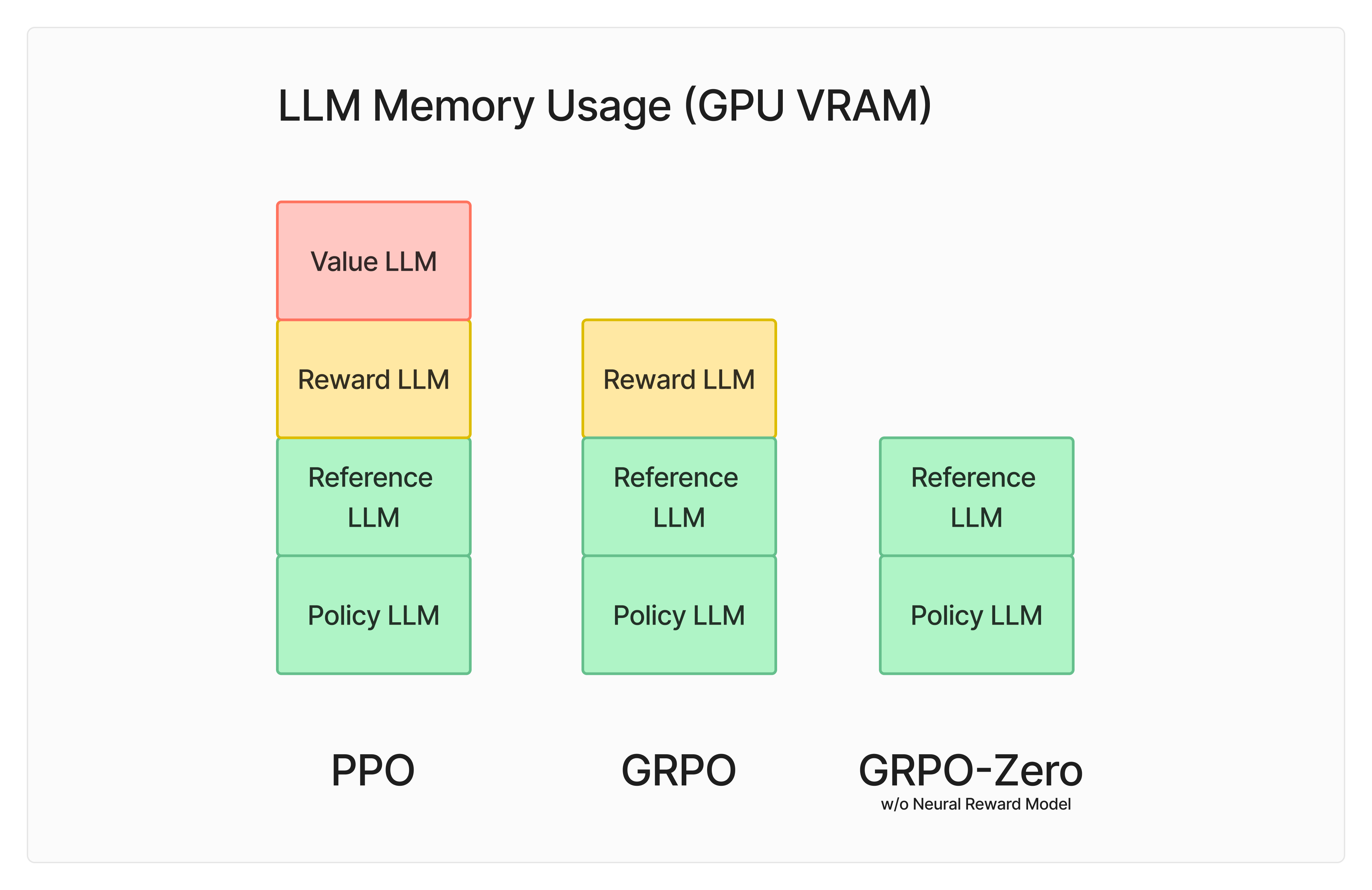 You don’t even need a full reward model LLM in the loop during training. This leaves us with the policy model and the reference model as the main memory requirements. Dropping the need of 4 LLMs to 2 gives us the huge reduction in GPU requirements.